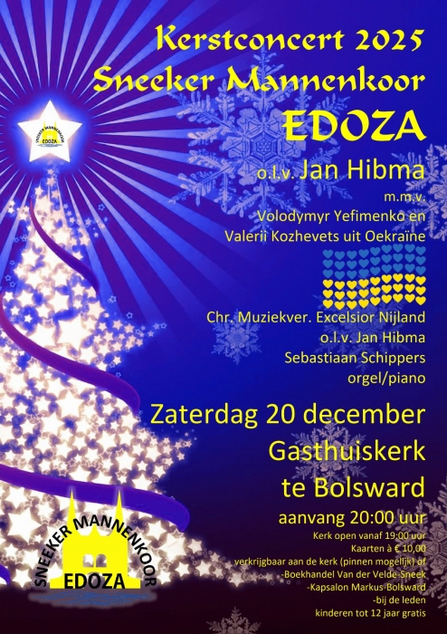 Op zaterdag 20 december a.s. organiseert het Sneeker Mannenkoor EDOZA een groot kerstconcert onder leiding van Jan Hibma in de Gasthuiskerk in Bolsward.