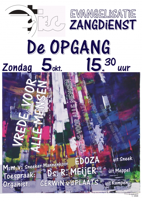 Op zondamiddag 5 oktober 2025 zal het Sneeker Mannenkoor Edoza, o.l.v. dirigent Jan Hibma, weer medewerking verlenen aan de zangdienst in De Opgangkerk in Hoogeveen.